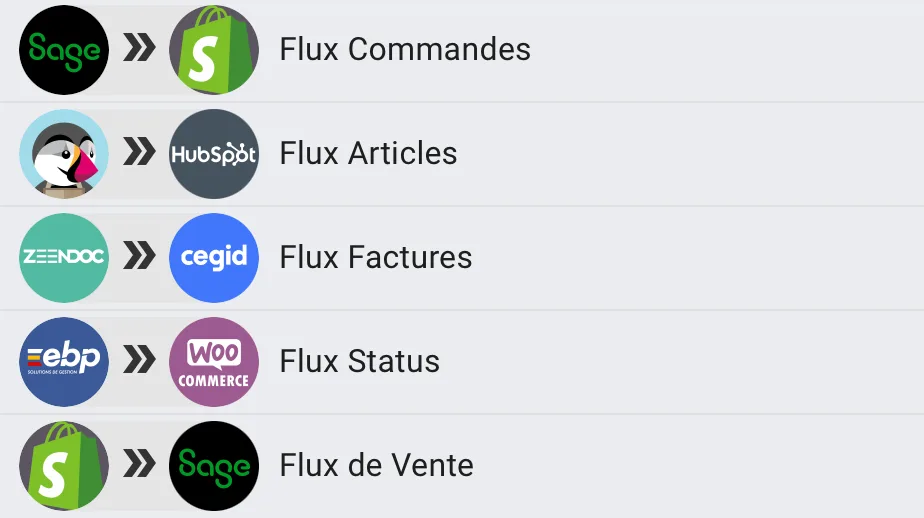 Open Flux connecte tous vos systèmes : ERP, CMS e-commerce, CRM, GED, bases financières, gestion d’entrepôt ainsi que vos logiciels métiers, pour un échange d’informations fluide et automatisé.